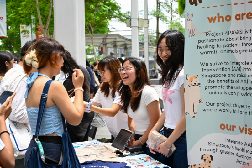 A student from NUS 4PAWsitivity promoting its causes. 4PAWsitivity is a project under NUS Medicine that aims to raise awareness of Animal Assisted Interventions.